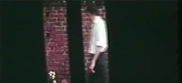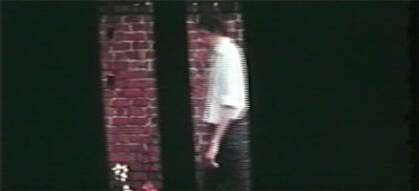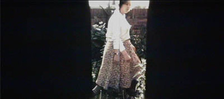 DUET uses a horizontally extended screen, effected by employing two standard 16mm images projected adjacent to one another. Two vertical bars move back and forth across the width of half the frame. Through these apertures a girl is seen walking back and forth, in a similar manner to the bars. The movement of each of the bars is fairly constant whilst that of the figure is erratic. Each section of the film, i.e. right and left hand images, was shot entirely at random - the matte being moved by hand and the figure's movement being decided by herself. DUET was preceded by two earlier forms; both of which were abandoned. The first (Summer 1974) used a single image, the camera panning constantly between two points whilst the figure moved at random within, and without the frame. In the second version the camera described a circle, the figure moving along the circumference of circles at varying radii.