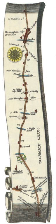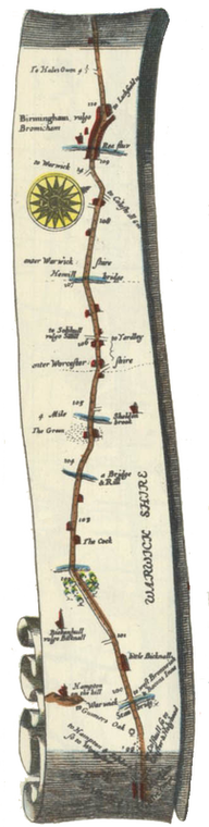 The 'strip maps' of John Ogilby were amongst the first road maps of England and Wales. First produced in 1675, these were 'process' maps rather than the 'state' maps with which we are more familiar from the conventional road atlas. Process maps showed the route from one specific place to another and consequently distorted spatial geography at the expense of illustrating the traveller's route as a straight line with landmarks and junctions indicated to confirm the correct route. One of the things that attracts me to these maps is the concept of trajectory, of a narrative that they capture and offer to us even today, over 330 years later. Their scroll structure is also very much like a strip of film with its unfolding trajectory.